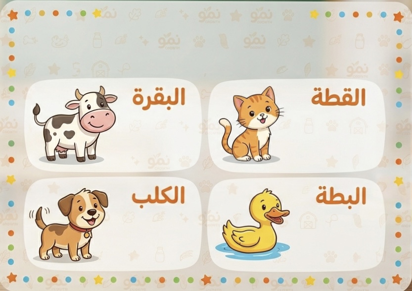 نشاط ممتع يُحفّز الطفل على تقليد الأصوات وهي الخطوة الأولى نحو الكلام الحقيقي، حيث تُستخدم صور أو دمى الحيوانات لربط الصوت بالشكل وتوسيع الحصيلة اللغوية.