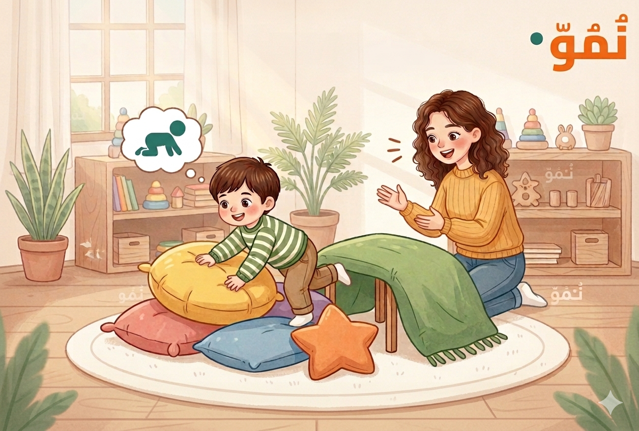 مسار عقبات بسيط يُحفز الطفل على التنقل بطرق مختلفة بين الوسائد، مما يقوي عضلاته