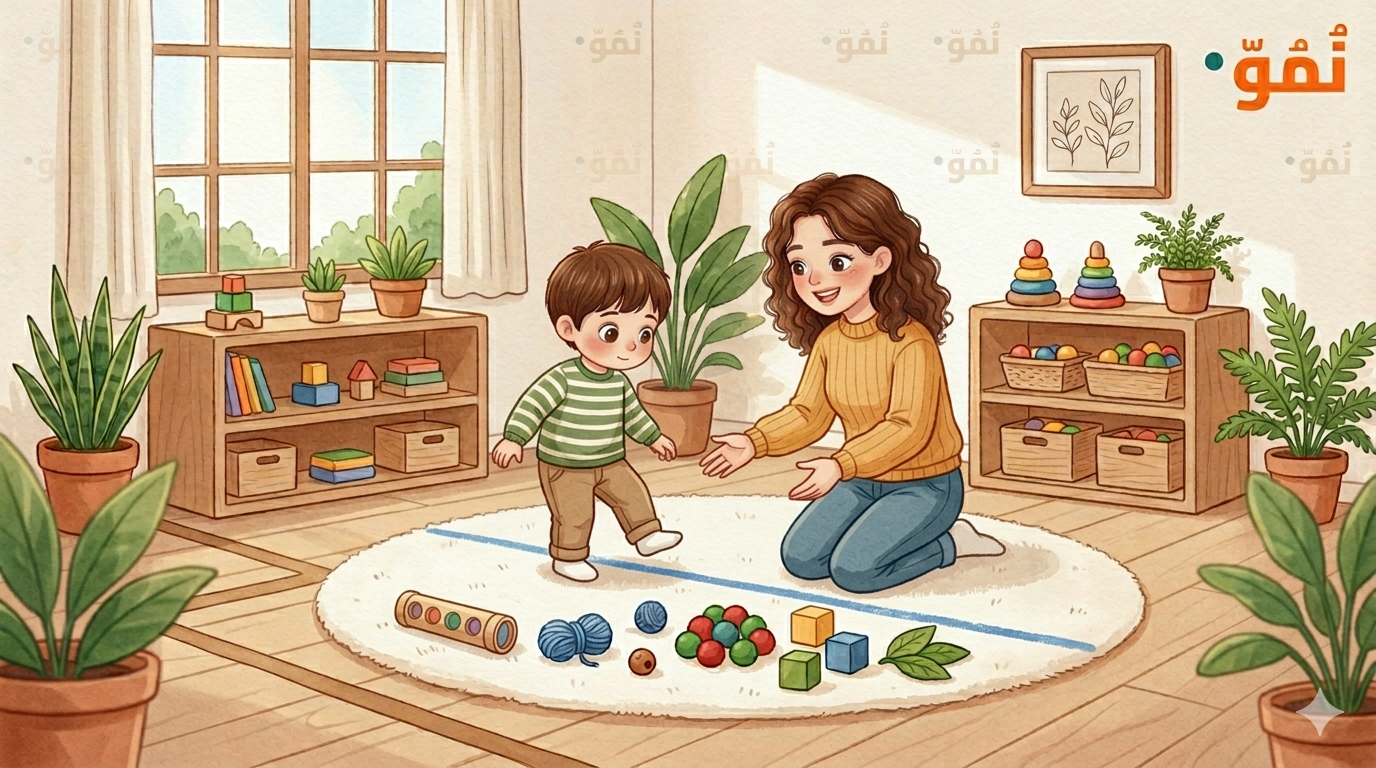 السلامة أولاً: تأكدي من أن الأرض غير زلقة. تجنبي المناطق بالقرب من الأثاث الحاد. ابقي قريبة للإمساك به إذا فقد توازنه.